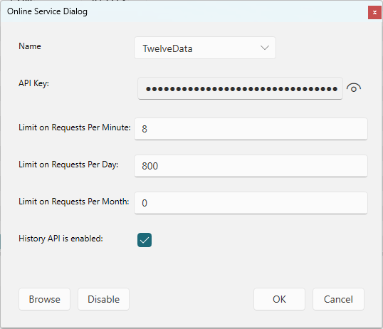 MyMoney can download from twelvedata.com or yahoo.com . These services require a registered account and will provide an API Key which you enter here. Depending on your plan you will also have limits on the number of requests per minute or per day or per month. Enter those numbers here and MyMoney will ensure those limits are not exceeded. Just leave the value at 0 if there is no limit. MyMoney recommends using twelvedata.com.